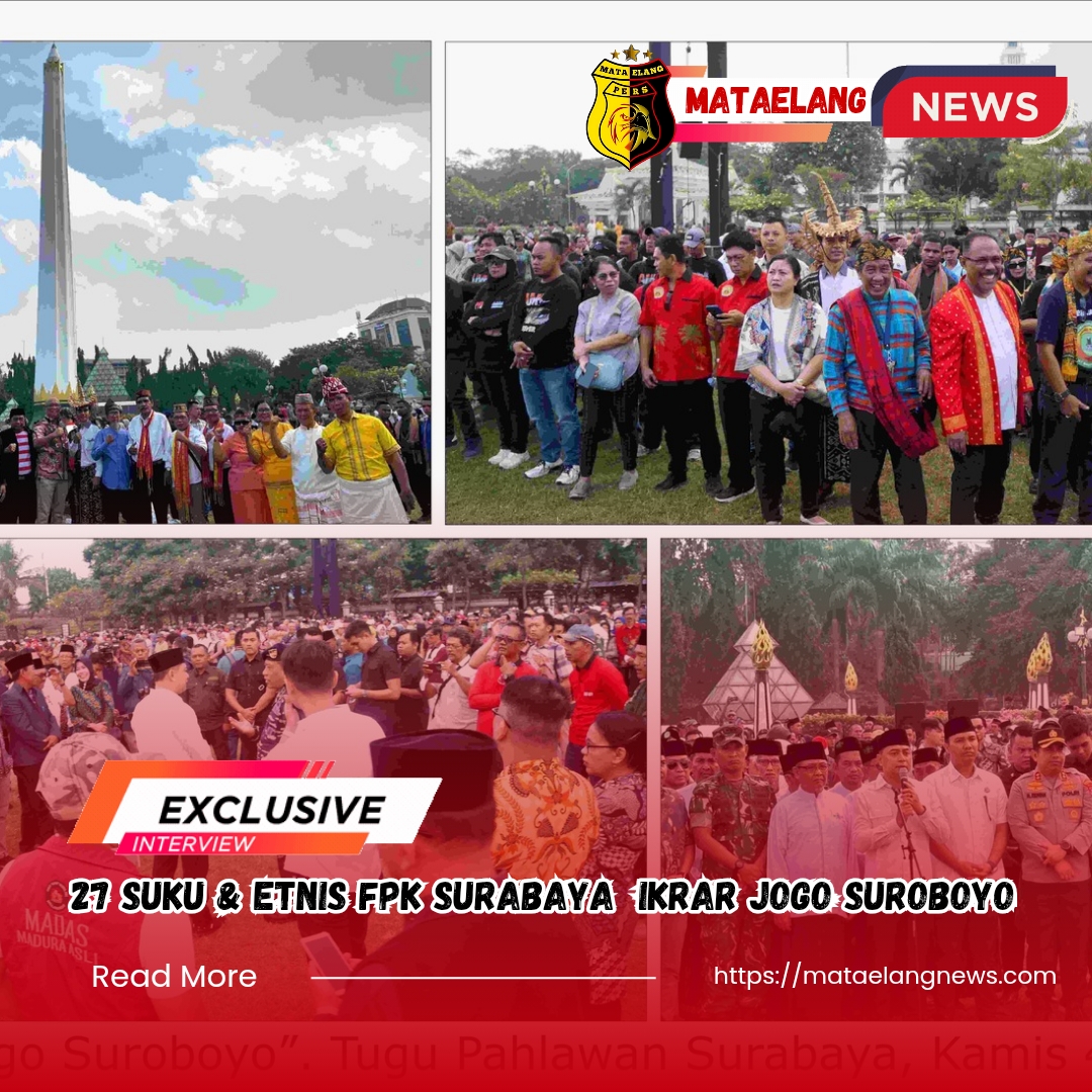 Mataelangnews.com || Surabaya-Indonesia,- Ribuan warga Kota Surabaya dari berbagai suku,/etnis/agama, Forum Pembauran Kebangsaan (FPK) kota Surabaya, FKUB (Forum Komunikasi Umat Beragama), Tokoh Agama, Tokoh Masyarakat, Organisasi Kemasyarakatan, bersama Wali Kota Eri Cahyadi dan jajaran Forkopimda Kota Surabaya berikrar ‘Jogo Suroboyo’ di Tugu Pahlawan, Kamis, 4/9/2025. Pemkot bersama masyarakat Surabaya bersepakat menjaga keamanan, menjauhi provokasi, serta mengedepankan musyawarah dan menjunjung tinggi persatuan dalam menyampaikan aspirasi.