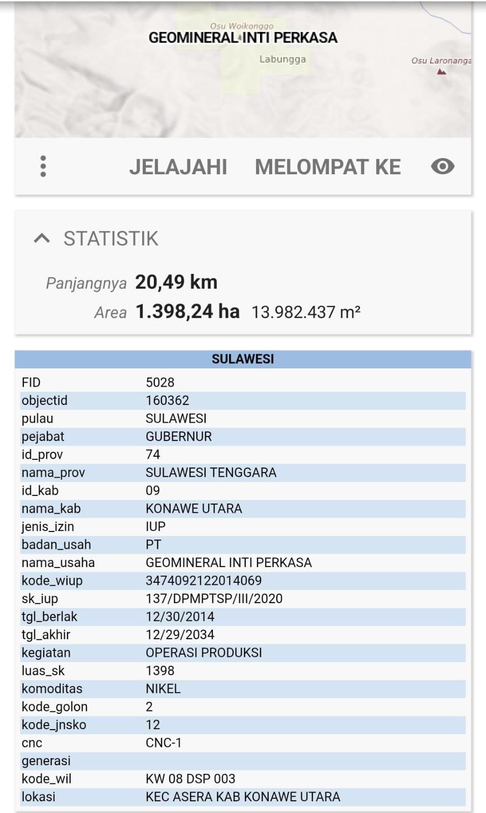 Dijelaskan oleh Annas, S.Sos., bahwa Perusahaan tambang PT.GEOMINERAL INTI PERKASA2. Izin iup PT.GIP di terbitkan oleh SK Gubernur Sulawesi Tenggara pada tahun 2023 SK IUP: 137/DPMPTSP/III/2024. Izin Usaha Pertambangan (IUP) PT.GIP Terbit pada tanggal 12/30/2014 dan berakhir 12/29/2034, selanjutnya Izin Prinsipal terbit pada masa pemerintahan bapak Aswad sulaiman di tahun 2014.Luas 1.398,24 HA.