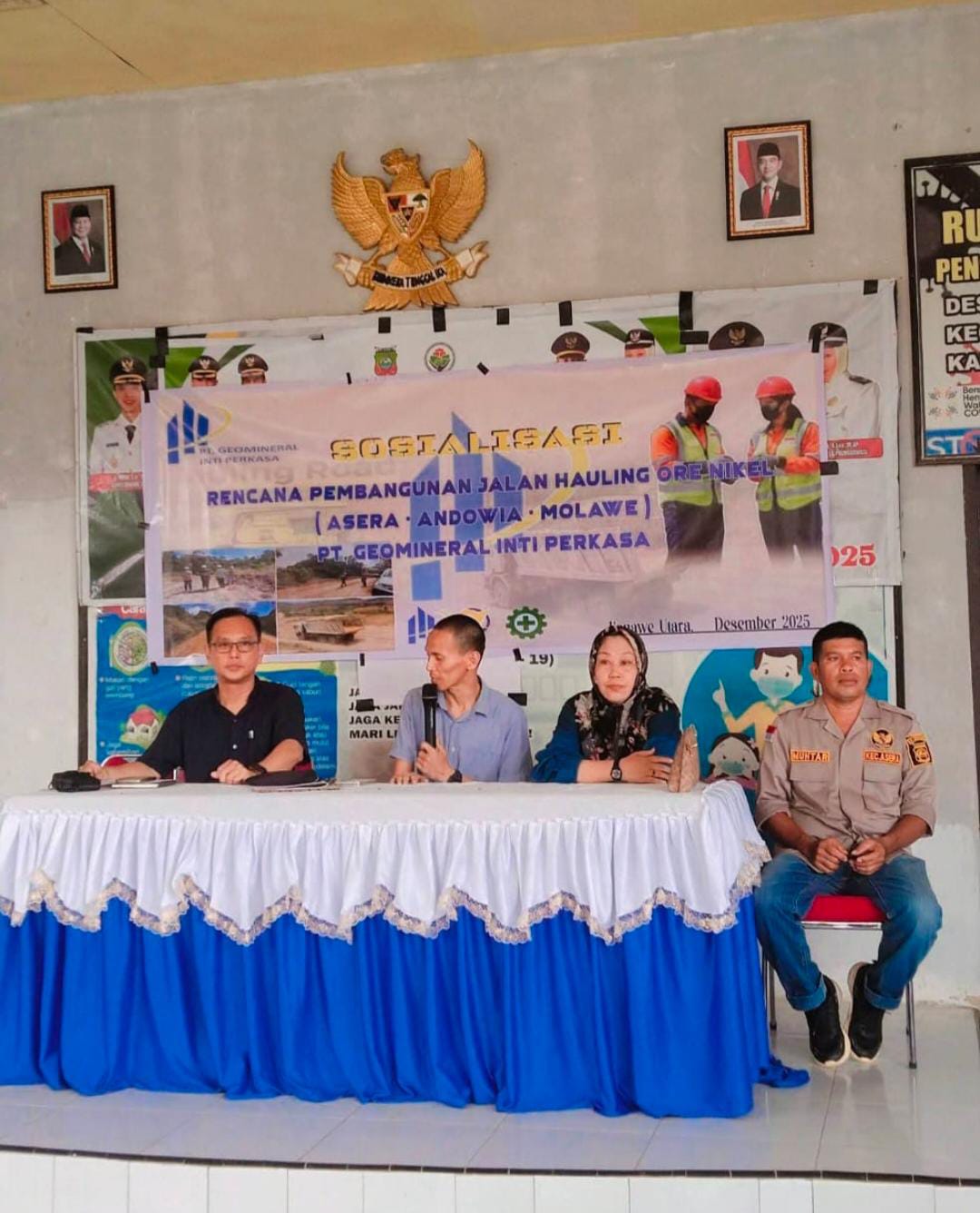 Mataelangnews.com || Konawe Utara-Sultra, -Perusahan PT Geomineral Inti Perkasa2 (PT.GIP), di ketahui merupakan salah satu perusahaan yang kini di kabarkan tengah aksist melakukan sosialisasi kemasyarakat untuk melakukan penambangan ore nikel di wilayah Geografis kabupaten Konawe Utara. Terinformasi bahwa baru-baru ini perusahaan tersebut tengah melakukan sosialisasi di wilayah kecamatan Asera yang saat ini di Pipin oleh Aswar Amirudin SH, MM., Selaku Camat Asera.
