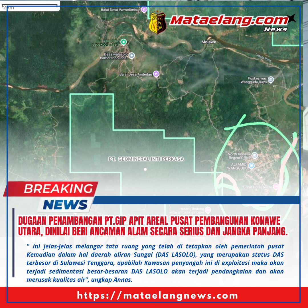 Menyoroti Soal Wilayah yang Saat ini berada di lingkaran IUP PT.GIP, merupakan Kawasan Daerah Penyangga Aliran (DAS) SUNGAI LASOLO, Annas Menyebutkan Sebagaimana status hutannya Adalah hutan produksi dan hutan lindung, maka Ketika Perusahaan tersebut beraktivitas bukan hanya akan mengancam pemukiman Masyarakat dan beberapa desa dan termaksud mengancam daerah aliran sungai (DAS) lasolo yang selama ini sebagai penyangga air bersih maupun penyanga air untuk kebutuhan pertanian daerah asera dan andowia” ujar Ketua DPC Konut JPKN itu ke media.
