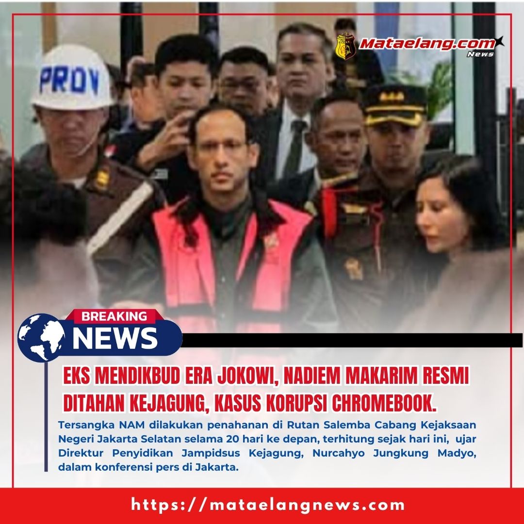 Mataelangnews.com || Jakarta-Indonesia, – Kejaksaan Agung (Kejagung) resmi menetapkan mantan Menteri Pendidikan, Kebudayaan, Riset, dan Teknologi, Nadiem Anwar Makarim, sebagai tersangka dalam kasus dugaan korupsi pengadaan laptop berbasis Chromebook, Kamis (4/9/2025). Setelah ditetapkan sebagai tersangka, pendiri Gojek tersebut langsung ditahan untuk kepentingan penyidikan.