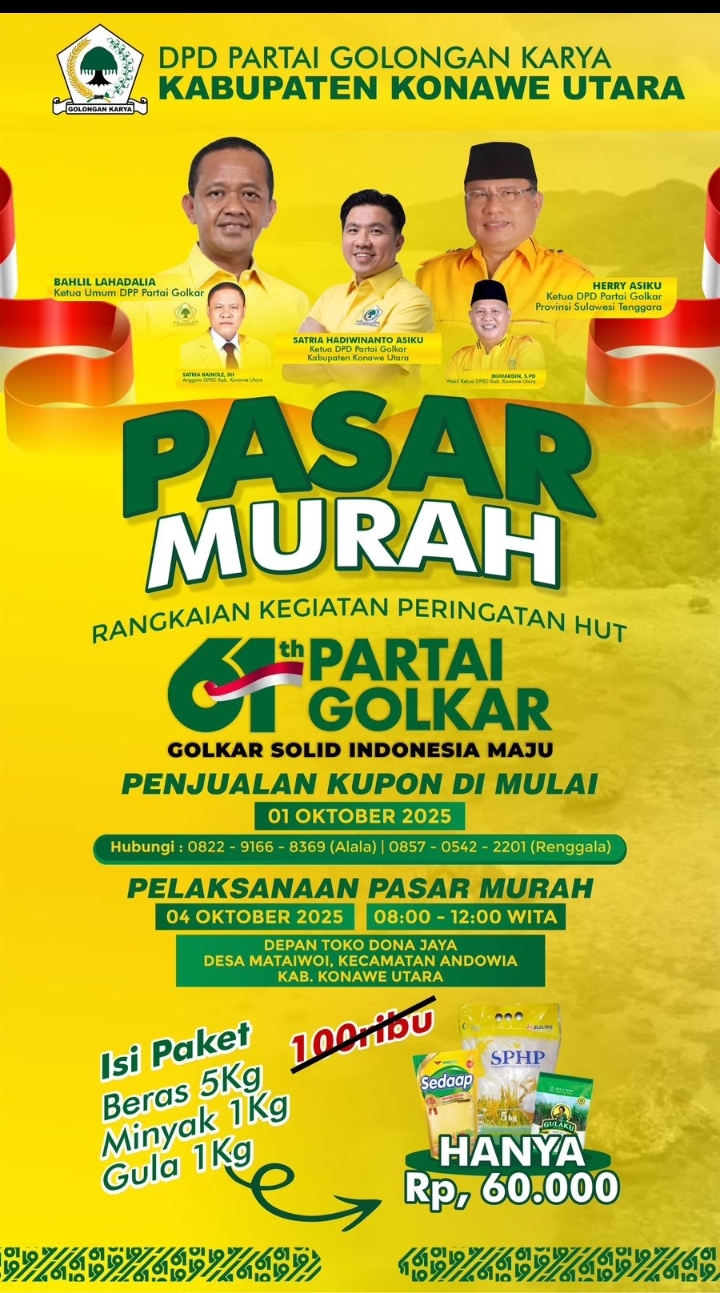 Mataelangnews.com || Kon‍aweUtara-Sultra_ kegiatan pasar murah yang di selenggarakan oleh partai golkar , tanggal 4 Oktober bulan 10 tahun 2025 bertempat di toko dona jaya alamat, desa mataiwoi kecamatan andowia kabupaten konawe utara, dalam pelaksanaan kegiatan ini di anggap terkesan mendadak dan tiba tiba saja muncul pamplet kegiatan pasar murah, tanpa ada rapat dan pemberitahuan pada kader dan pk.